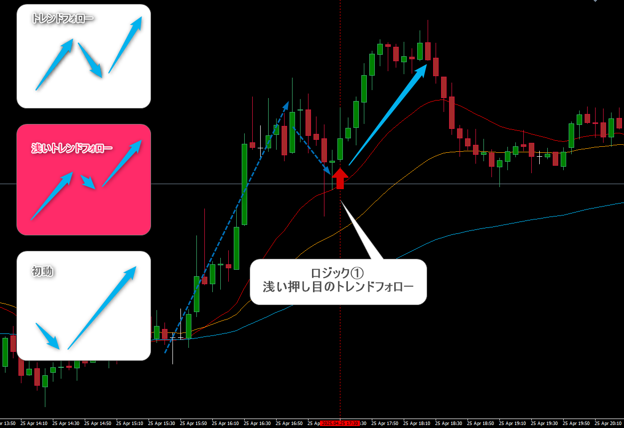 ロジック①はトレンドフォローと1波初動を狙う手法です。